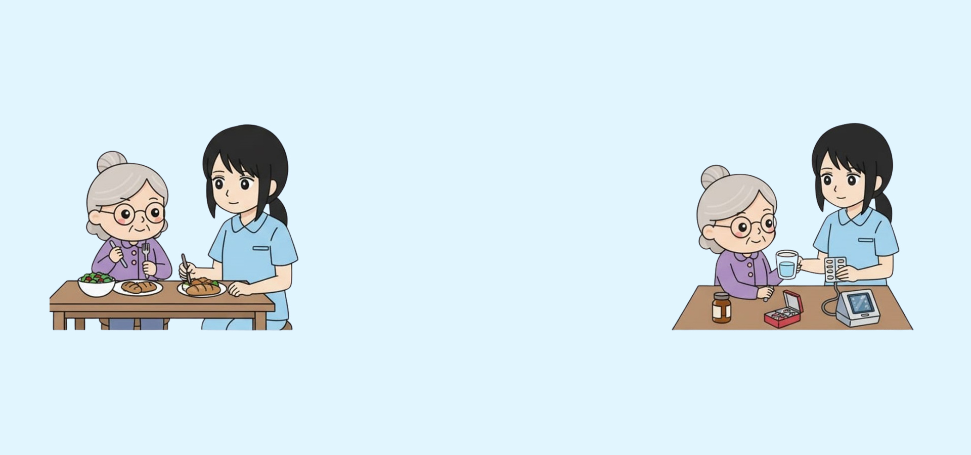 Ayuda completa durante las comidas, apoyando desde la preparación del entorno hasta el acompañamiento al comer, promoviendo hábitos saludables y bienestar continuo.